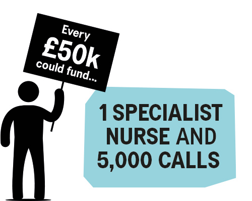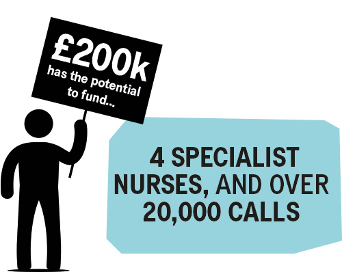 Every £50k you help raise will fund one Specialist Nurse and 5,000 calls. That means, thanks to you, £200k will fund four nurses and 20,000 calls from men and their loved ones, when they need us most.