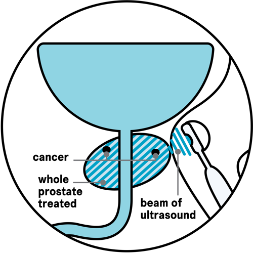 High-intensity focused ultrasound (HIFU) uses high-frequency ultrasound energy to heat and destroy cancer cells in the prostate. A beam of ultrasound energy travels into the prostate from a probe put into the back passage (rectum).